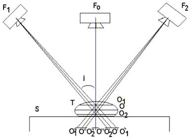 F0, F1, F2 -нулевое,исходное и конечное положение фокуса рентгеновской трубки; j-1/2 угла поворота трубки; S-поверхность стола; Т-объект исследования; О-точка выделяемого слоя; О1, О2-точки, находящиеся выше и ниже выделяемого слоя; О`, О``-проекции точки О на пленке при исходном и конечном положениях фокуса рентгеновской трубки; О1`, O1``-проекции точки О1 на пленке при тех же положениях фокуса трубки; О2`, О2``-проекции точки О2 при тех же положениях фокуса трубки; О```-проекции всех точек на пленке при нулевом положении рентгеновской трубки. Рентгеновский излучатель и кассето-держатель с приемником излучения (рентгеновская пленка, селеновая пластина) соединяют жестко с помощью металлического рычага. Ось вращения рычага (перемещения трубки и пленки) находится над уровнем стола и ее можно произвольно перемещать.
