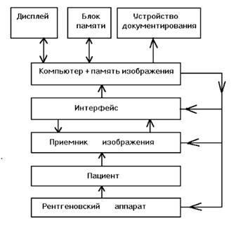 Рентгеновская трубка и приемник изображения сопряжены с компьютером и управляются им, а получаемое изображение запоминается, обрабатывается (в цифровой форме) и отображается на телеэкране, составляющем часть пульта управления (или устройства вывода данных) оператора-рентгенолога.