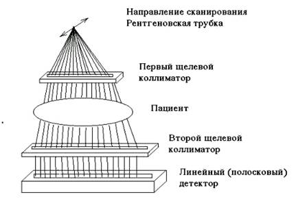 Указанного недостатка лишена аксиальная компьютерная рентгеновская томография. Это объясняется тем, что строго коллимированный пучок рентгеновского излучения проходит только через ту плоскость, которая интересует врача. При этом регистрация рассеянного излучения сведена к минимуму, что значительно улучшает визуализацию тканей, особенно мало контрастных. Снижение регистрации рассеянного излучения при компьютерной томографии осуществляется коллиматорами, один из которых расположен на выходе рентгеновского пучка из трубки, другой - перед сборкой детекторов.