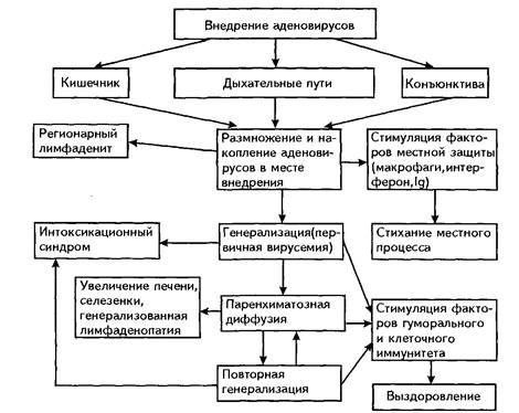 Для остропротекающих аденовирусных заболеваний человека наиболее характерен первый тип взаимодействия, т.е. литическая инфекция. В патогенезе аденовирусных заболеваний типичным считается поражение слизистых оболочек дыхательных путей, конъюнктив, кишечника, лимфоидной ткани.
