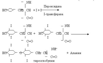 Пептидергические нейроны в преоптической области гипоталамуса синтезируют и выделяют в воротную систему гипофиза тиреотропин-рилизинг гормон (ТРГ). ТРГ стимулирует выработку в клетках гипофиза тиреотропного гормона (ТТГ). ТТГ представляет собой гликопротеид с молекулярной массой 29000. ТТГ может влиять на развитие тиреоидных фолликулярных клеток, предшествующих образованию самих фолликулов в щитовидной железе. Так, было показано, что тиреоидные клетки in vitro, диспергированные с помощью протеолитических ферментов, при добавлении в среду ТТГ вновь собираются в молекулы. Это показывает, что ТТГ способствует синтезу каких-то компонентов клеточной мембраны, необходимых для распознавания друг друга. ТТГ-рецепторный комплекс, образующийся в результате связывания ТТГ, вызывает ответные биологические реакции с помощью не менее четырех внутриклеточных посредников: цАМФ, инозитолтрифосфата, диацилглицерола и комплекса Са2+-кальмодулин. Интересно, что активация аденилатциклазы в мембранах тиреоидных клеток под действием ТТГ в основном обуславливается ингибированием Gи-белка. Под влиянием ТТГ в клетках тиреоидных фолликулов возникают глубокие морфологические изменения. Тиреоидная клетка в высокой степени полярна: на ее апикальной поверхности имеются многочисленные микроворсинки (увеличение площади), к которым прилегают запасы коллоида в фолликуле. Базальная поверхность клетки контактирует с кровью. Коллоид представляет собой белковый раствор богатый на остаток аминокислоты тирозина. В ходе биохимических реакций фенольный гидроксид тирозина соединяется с фенолом другого тирозина и присоединяя к себе йод образуется тетрайодтиронин, связанный пептидными связями с остатками других аминокислот. Такие белки называются тиреоглобулинами.