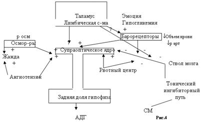 Антидиуретический гормон (АДГ) ¾ это только один из компонентов сложного комплекса нейрональных, эндокринных и поведенческих механизмов, совместное действие которых обеспечивает гомеостаз жидкости и электролитов в организме. Однако на первой линии обороны гомеостаза располагаются АДГ, ренин-ангиотензин-альдостерон. Между тремя механизмами поддержания постоянства жидкости, электролитов и объема (АДГ, ренин-ангиотензин-альдостероновая система, жажда и питьевое поведение) тесная связь.