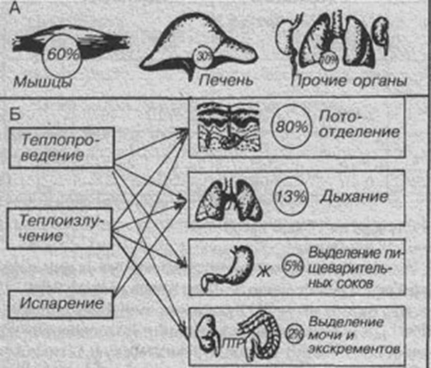 Живой организм продуцирует тепло, которое идет на нагревание тела. Удельная теплоемкость тела человека (количество тепла, необходимое для нагревания ткани на 1°С) равна в среднем 0,83 ккал/кг на 1 градус (для воды — 1 ккал/кг на градус). Чтобы повысить температуру тела человека массой 70 кг на 1°, следует затратить 58,1 ккал (0,83•70). В среднем человек массой 70 кг в условиях покоя выделяет около 72 ккал/час. Следовательно, если бы не было второго процесса — теплоотдачи, то ежечасно ткани человека нагревались бы на 1,24° (72:58,1). Однако такого не происходит, так как в норме в условиях покоя скорость продукции тепла равна скорости ее потери. Это носит название теплового баланса, в основе которого лежат процессы регуляции теплопродукции и теплоотдачи. Все вместе это называется терморегуляция.