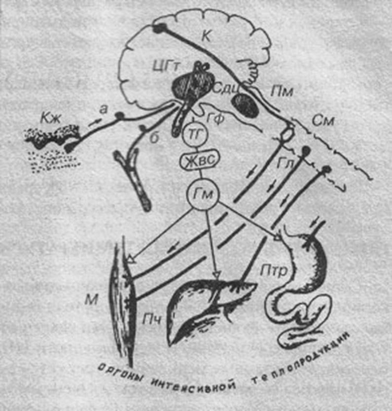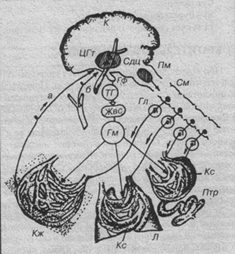 К – кора, Кж – кожа, ЦГт – центры гипоталамуса, Сдц – сосудодвигательный центр, Пм – продолговатый мозг, См – спинной мозг, Гф – гипофиз, ТГ – тиреотропный гормон, Жвс – железы внутренней секреции, Гм – гормоны, Птр – пищеварительный тракт, Кс – кровеносные сосуды, Л – легкие, а, б – поток афферентной импульсации.