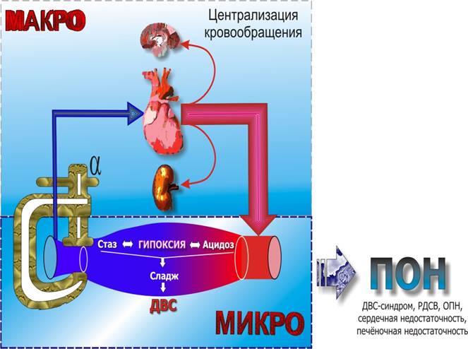 - В периферических сосудах развиваются последовательно сгущение крови, сладж-феномен и внутрисосудистое свертывание (ДВС-синдром). Сладж и микротромбооразование еще больше ухудшают перфузию периферических органов и постепенно приводят к развитию ПОН (полиорганная недостаточность).
