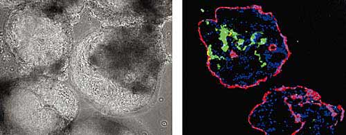 По мере созревания внутри плотных клеточных шариков появляются полости, и через некоторое время эмбриоидное тельце превращается в сферу. Справа показано иммуногистохимическое окрашивание срезов эмбриоидных телец антителами к клеткам эпителия (красный), мезодермальным клеткам (зеленый), синим окрашены ядра клеток. Увел. 50.