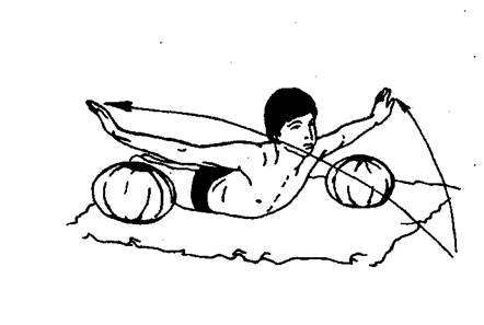 3) вытянуть руки вперед, медленно отвести назад к бедрам, пронося над медицинболами, поставленными на уровне лопаток, («пловец») рис. 3;