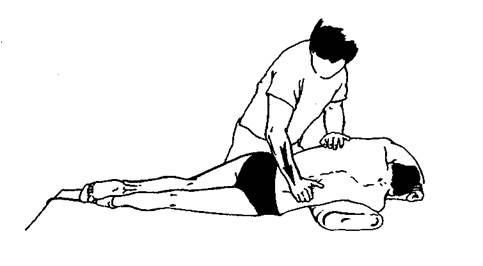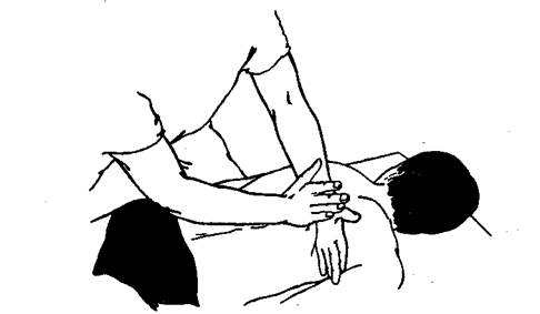 После этого выполняется разминание основанием ладони левого разгибателя спины на поясничном уровне резкими отрывистыми ритмичными толчками (2—3 минуты). (Рис. 11). В этом же положении выполняется массаж и растягивание большой грудной мышцы. (Рис. 12).