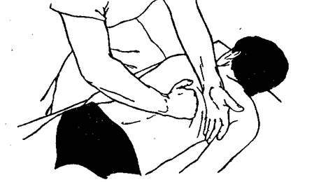 Массажист устанавливает основание правой ладони на медиальный край правого разгибателя спины на уровне L-Y — S-I, второй — пятый пальцы поддерживают латеральный край; используя вес тела, плавными ритмичными движениями, направленными вертикально вниз оттягивает мышцу от позвоночника, постепенно продвигаясь краниально до верхнепоясничного отдела «переступанием» с тенара на гипотенар (3—4 прохода за 5—7 минут). (Рис. 10).