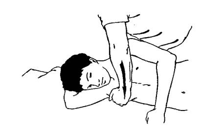 4. Затем массажист укладывает больного на правый бок лицом к себе. Под грудную клетку подкладывает плотную подушку толщиной 6—8 см. Правое предплечье — под головой, левая рука вытянута вперед. Левая нога слегка согнута, лежит впереди правой (это создает небольшой вентральный наклон). На правой ноге в области голеностопного сустава закрепляется браслет. К браслету прикреплен шнур с крюком, на крюк навешиваются мешочки с песком. Вес мешков составляет 10—20% от веса пациента.