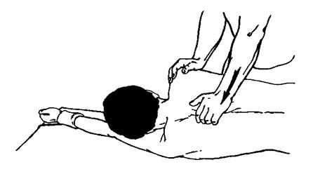 2. Затем выполняют глубокое трение ребром ладони с отягощением — длинными движениями вдоль позвоночника в темпе — одно движение за 1—1,5 секунды, поочередно слева и справа, по 10—12 движений с каждой стороны (рис. 7). (Недопустимо жесткое давление на костные выступы).