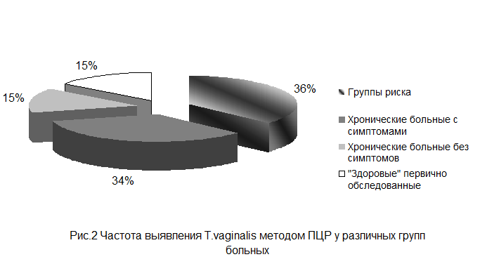 Метод ПЦР подтвердил наличие трихомонад у больных отнесённых к группе риска на 36%. У хронических больных с характерными симптомами этот показатель составил 34%, хронические больные без симптоматики и «здоровые» первично обследуемые, дали по-15% подтверждения. Данная информация отражена на рисунке 2.