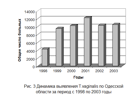 3.Пик заболеваемости трихомонозом по Одесскому региону приходится на 2001год, наименьший показатель отмечался в 1998 году. Начало 2004 года характеризуется небольшим подъемом заболеваемости.