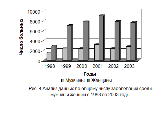 Таким образом, за 1998 год возбудитель впервые выявлен у 4338 человек, среди них: мужчины – 1462, женщины – 2867. За 1999 год, заболело 9543 человек, из которых: мужчин – 2479, женщин – 7064. В 2000 году общее число больных оставило 10242 человек. Среди них: мужчин – 2411, женщин – 7831. Общее количество больных в 2001 году составило 12265: мужчин – 3243, женщин – 9022. За период 2002 года всего заболело 10329 человек, где мужчины составили 2448, женщины – 7881. 2003 год дал общее число больных 10541, из которых мужчины составили 2833, а женщины – 7708.