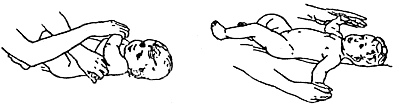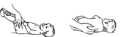 Вихідне положення: на спині, ноги прямі. При втриманні дитини правою рукою за стопи, а лівою рукою за зігнуту в лікті праву руку маляти, шляхом повороту таза стимулюють поворот зі спини на живіт уліво. Для повороту дитини вправо треба лівою рукою обхопити його стопи, а правої — зігнуту в лікті ліву руку маляти. 1-2 рази в кожну сторону.