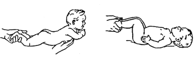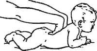 Вихідне положення: на спині, ногами до краю стола. Однією рукою злегка піднімають ноги дитини, захопивши їх вище гомілковостопного суглоба, і вказівним пальцем друг ой руки злегка надавлюють у кореня пальців на підошву дитини, чим викликають рефлекторне згинання пальців; потім проводять пальцем по зовнішньому краї стопи до п'яти, викликаючи рефлекторне розгинання пальців ноги. 3-4 рази.