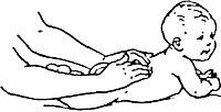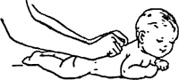 Застосовують дитині з 2-місячного віку. Вихідне положення: на животі, ногами до краю стола. Поглажування. Роблять поглажування спини по напрямку від сідниць до шиї двома пальцями рук (мал. 5а) або тильними поверхнями кистей обох рук (мал. 3.5б). 4-6 разів.