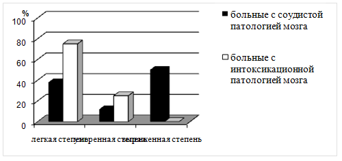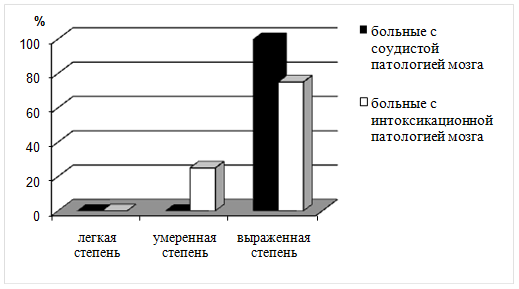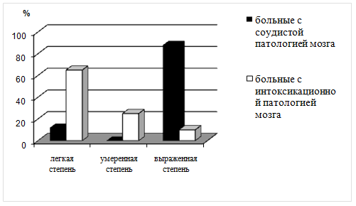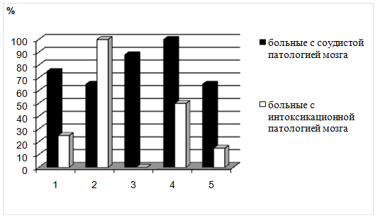 Данные нейропсихологического исследования указывают на большую выраженность функциональной недостаточности глубинных структур головного мозга, а именно нижних отделов ствола и деинцефальных отделов головного мозга у больных с сосудистой патологией. Также при данной патологии выявляется функциональная недостаточность теменно-затылочной и примыкающей к ней височной области, в отличии от больных с интоксикационными патологиями мозга, где определяется функциональная недостаточность нижних теменно-затылочных отделов голоного мозга, преимущественно правого полушария.