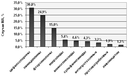 Среди ЛС, которые являются причинной аллергических реакций, чаще встречаются антибиотики (особенно пенициллинового ряда) – до 55%, нестероидные противовоспалительные средства (НПВС) – до 25%, сульфаниламиды – до 10%, местные анестетики – до 6%, йод и бромсодержащие препараты – до 4%, вакцины и сыворотки – до 1,5%, препараты, что влияют преимущественно на тканевые процессы (витамины, ферменты и другие средства, которые влияют на метаболизм), - до 8%, другие группы медикаментов – до 18% [20, 58].