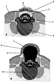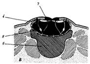 1—кожа, 2—пучок волос, 3—твердая мозговая оболочка, 4— субарахноидальное пространство, 5—спинной мозг, 6—тело позвонка, 7—открытая нервная пластинка, 8—спинной чувствительный узел