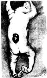 Рис.2. Различные варианты расщелины позвоночника. А — скрытая расщелина; Б —полный рахисхиз; В, Г — кистозная расщелина: