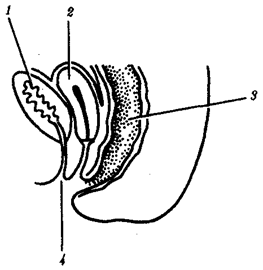 1—мочевой пузырь, 2—матка, прямая кишка, 4—клоака