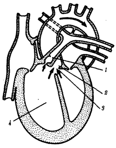 1—стеноз легочного ствола. 2—транспозиция аорты, 3—дефект межжелудочковой перегородки, 4—гипертрофия правого желудочка; стрелками показано направление движения крови
