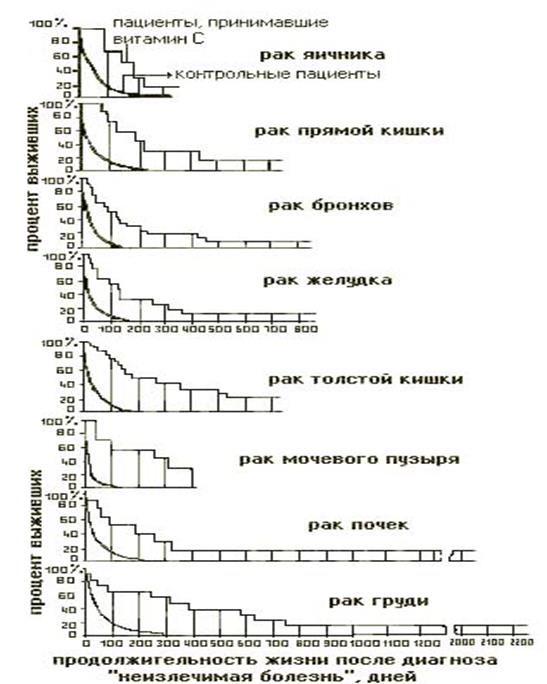 Рис.2 Действие сверхдоз аскорбиновой кислоты при восьми видах онкологических заболеваний.