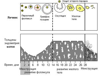 Главную роль в регулировании репродукции у женщин, как и мужчин, играют гипоталамус и гипофиз. Однако, у женщин секреция гормонов – процесс циклический, повторяющийся примерно через каждые 28 сут (менструальный цикл).