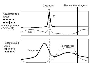 По мере роста фолликула увеличивается секреция им эстрогена, и в середине цикла содержание эстрогена в крови достигает максимума; это запускает секрецию ЛГ (обратный позитивный эффект). В результате воздействия ЛГ на яичник происходит овуляция (происходит поочередно, то в одном, то в другом яичнике).