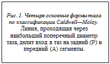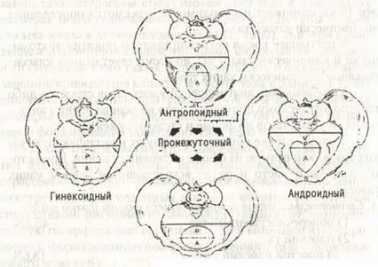 За рубежом широко используют классификацию Caldwell-Moloy (1933), учитывающую особенности строения таза: 1) гинекоидный (женский тип таза), 2) андроидный (мужской тип), 3) антропоидный (присущий приматам), 4) платипеллоидный (плоский) (рис, 1).