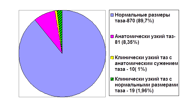 2. По классификации анатомически узкого таза на 1-м месте находится поперечносуженный таз – 58%, что совпадает с литературными данными – 45,2%. На 2-м месте по данным нашего анализа располагается общеравномерносуженный таз – 37%, по данным литературы – 8,5%. На 3-м месте по частоте встречаемости занимает по нашим данным простой плоский таз – 2,47%, по литературным данным – 13,6%.