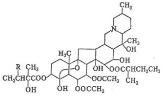 Молекулы алкалоидов второй группы содержат 7-9 атомов кислорода и находятся в растениях в виде сложных эфиров. Примерами могут служить протовератрины А (R = Н) и В (R = ОН), используемые в фармакологии.