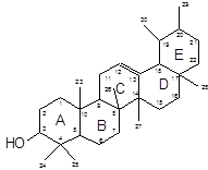 К группе a-амирина относятся сапонины почечного чая; b-амирина – сапонины солодок, каштана конского, сенеги, синюхи голубой, аралии маньчжурской.Пентациклические чаще всего имеют гидроксигруппу в положениях С3 , С16 , С21 , С22 , С24 ; карбоксильную группу у С28, С29 (глицирризиновая кислота), карбонильную – у С3 , С11 и др. группы. Гидроксигруппы могут быть этерифицированы органическими кислотами. Двойная связь чаще всего находится в положении С12 -С13 .