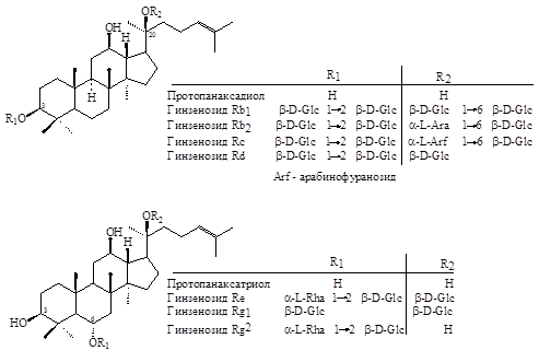 Химический состав. Корень женьшеня содержит смесь тритерпеновых тетрациклических сапонинов даммаранового ряда - панаксозиды (гинзенозиды). Кроме того, в корнях имеются эфирное масло (0,25-0,5%), пектиновые вещества (до 23%), витамины В1 , В2 и др., микро- и макроэлементы, крахмал (до 20%), даукостерин.