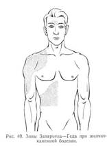 Часто кожа над областью желчного пузыря, а иногда и на более значительном протяжении в правой подреберной области болезненна, возникают зоны кожной гиперестезии (зоны Захарьина—Геда) (рис. 40). Во многих случаях положительны симптомы Мюсси, Ортнера идр.