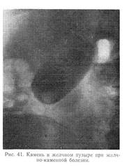 Рентгенологически (при контрастной холеграфии) обнаруживаются единичные или множественные камни (рис. 41). Реже тени конкрементов видны и на обзорной рентгенографии. Диагностическое значение в последнее время приобрела абдоминальная эхография.
