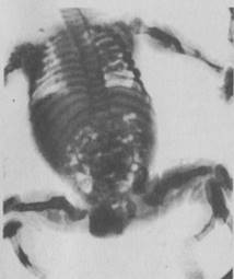 Первая форма несовершенного костеобразования проявляется в первые дни после рождения и характеризуется необычной ломкостью костей, встречается чаще, чем вторая, и протекает более тяжело. При этой форме дети нередко рождаются мертвыми или настолько маложизнеспособными, что вскоре умирают от присоединившихся интеркуррентных заболеваний. При врожденной форме заболевания наблюдается поражение всего скелета с деформациями конечностей, грудной клетки и черепа (рис. 1).