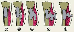 Рис. 3. Схема формирования гнойного свища при переходе острого гематогенного остеомиелита большеберцовой кости в хронический: а — абсцесс костного мозга; б — поднадкостничный абсцесс; в — межмышечная флегмона; г, д — этапы самостоятельного прорыва гноя с образованием свища.