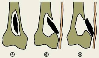 Рис. 4. Схематическое изображение вариантов расположения секвестров при остеомиелите: а — внутри костной полости; б — частично вне полости (перфорирующий секвестр); в — вне полости.