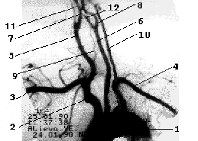 1- дуга аорты, 2- брахиоцефальный ствол, 3- правая ПКА, 4- левая ПКА, 5- правая ОСА, 6- левая ОСА, 7- правая ВСА, 8- левая ВСА, 9- правая ПА, 10- левая ПА, 11- правая НСА, 12- левая НСА.