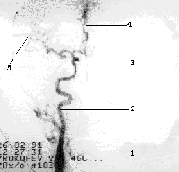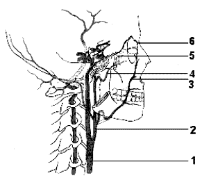 1- ОСА, 2- НСА, 3- лицевая артерия, 4- ПВА, 5- ГА, 6-глазничный анастомоз.