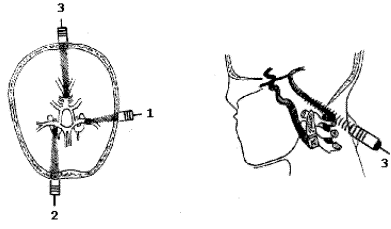 Исследуемый находится в положении лежа на спине. Голова откинута несколько назад так, чтобы были легко доступны для пальпации общие сонные артерии. Дистальный конец датчика устанавливается в медиальный угол глазницы так, чтобы ультразвуковой пучок был направлен в проекцию перекреста зрительных нервов. Легкими движениями проксимального конца датчика достигается максимальный устойчивый сигнал.