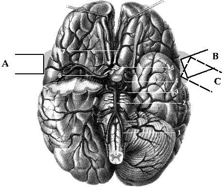 Внутренняя сонная артерия до входа в полость черепа ветвей не дает. Непосредственно после выхода из кавернозного синуса она отдает первую ветвь глазничную артерию, а затем делится на две конечные ветви - переднюю мозговую артерию и среднюю мозговую артерию (Рис 1.5).