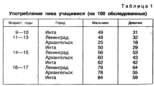 Недаром в народе говорят: «Реки начинаются с ручейка, а пьянство — с рюмочки». Во многих случаях приобщение к алкоголю начинается с пива, об употреблении которого учащимися писали психологи Б. С. Братцев и П. И. Сидоров в книге «Психология, клиника и профилактика раннего алкоголизма», вышедшей в 1984 году в издательстве МГУ (табл. 1).