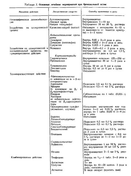 Лечение при бронхиальной астме представляет собой сложную задачу. Прежде всего оно должно быть комплексным, с широким применением лекарственных средств (табл. 2). Поскольку это заболевание по существу аллергическое, необходима противоаллергическая терапия с учетом особенностей течения астмы и наличия осложнений со стороны бронхов, легких, сердца. Важным моментом является купирование приступа.