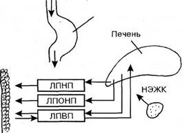 Липиды поступают в лимфу, а затем в кровь из кишечника в виде самых крупных липопротеидов - хиломикронов, из печени в кровь выходят липопротеиды очень низкой плотности. При липолизе из подкожной жировой клетчатки, легких, костного мозга освобождаются неэтерифицированные жирные кислоты (НЭЖК).