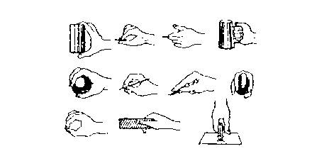 Большое значение в восстановлении бытовых и профессиональных навыков имеет трудотерапия, т.е. выполнение каких-то простейших трудовых манипуляций: изготовление конвертов, различные виды плетения, свертывание бинтов, наворачивание ваты на деревянные палочки и др (см. рис 1). Обычно в стационарах имеются специальные учебно-тренировочные стенды для восстановления функции кисти и пальцев, где можно отрабатывать различные бытовые манипуляции: открывание двери ключом, открывание и закрывание водопроводного крана и др. Примерное занятие ЛГ во втором периоде при повреждениях пястных костей и фаланг пальцев. С самого начала второго периода целесообразно проводить занятие в ванне (36—38°С) или в бассейне (28—30 °С), погружая всю руку вводу.