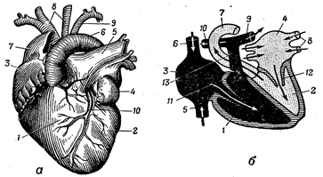 а – вид сердца спереди: 1 – правый желудочек; 2 – левый желудочек; 3 – правое предсердие; 4 – левое предсердие; 5 – легочная артерия; 6 – дуга аорты; 7 – верхняя полая вена; 8 – правая и левая общие сонные артерии; 9 – левая подключичная артерия; 10 – венечная артерия;