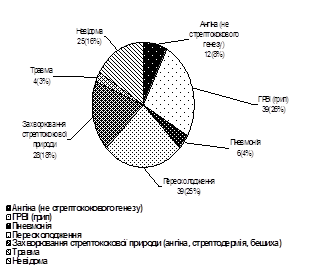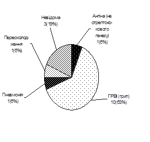 Таким чином, найчастіше причинами розвитку ГГН серед військовослужбовців є вірусні захворювання (49 з 169 – 26,9%), переохолодження (40 з 169 – 23,07%) та хвороби стрептококової природи (28 з 169 – 16,5%).
